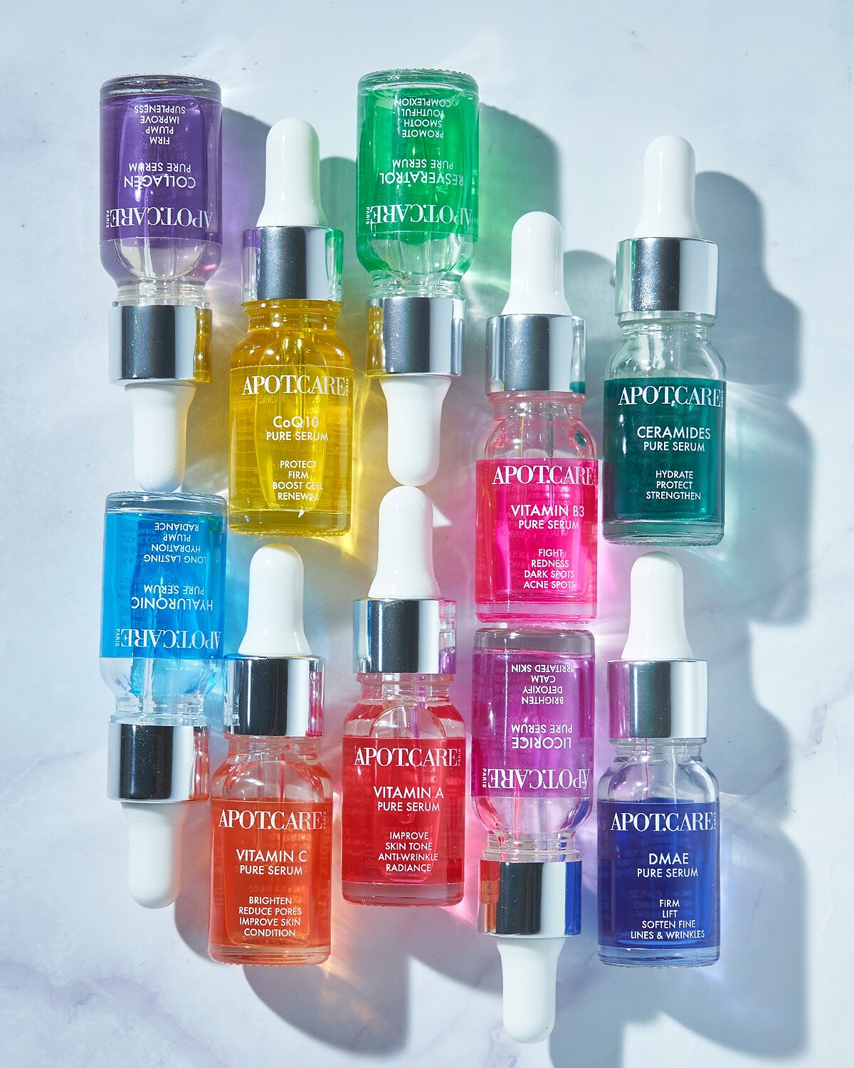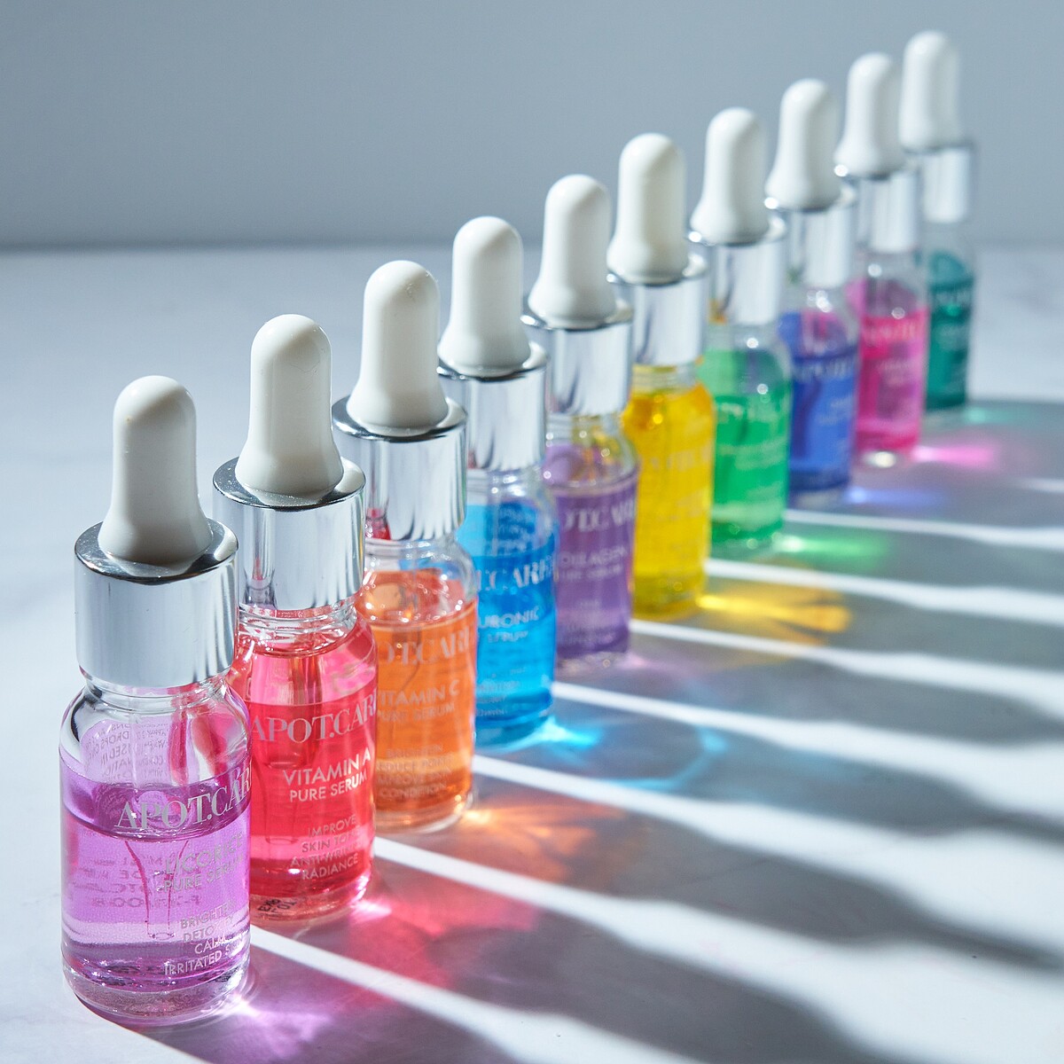 色彩繽紛的精華安瓶,光看就好療癒,不同顏色對應不同的肌膚問題,無論是單用、還是混搭都很可以。