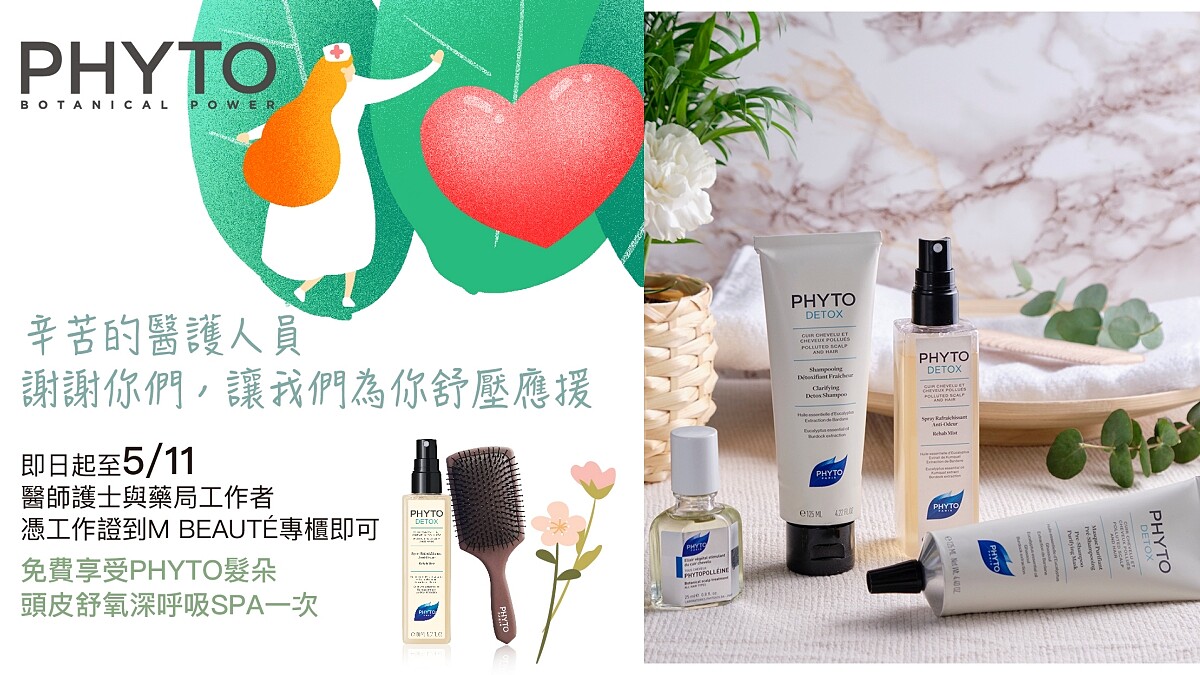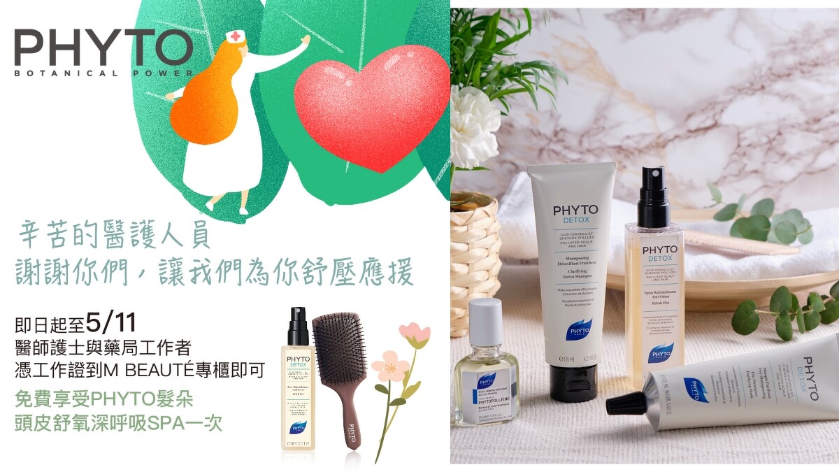 感謝全台醫護相關人員鎮崗守護, PHYTO髮朵即日起至2020/5/11(一)推出免費服務「頭皮舒氧深呼吸SPA活動」,誠摯邀請醫護工作者到全台MBEAUTÉ專櫃,預約15分鐘「 頭皮舒氧深呼吸SPA 」透過專業悉心頭皮按摩手技與DETOX舒氧淨化青春露,舒心感受源自法國天然植萃能量,紓緩緊繃筋絡與壓力累積。