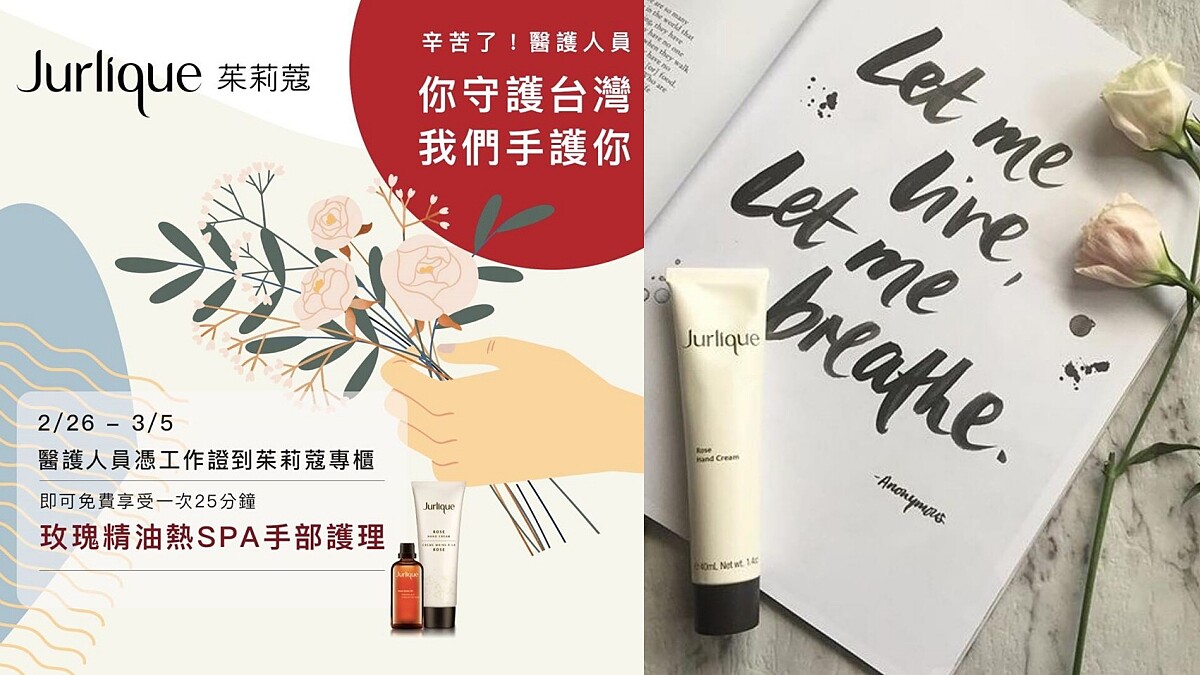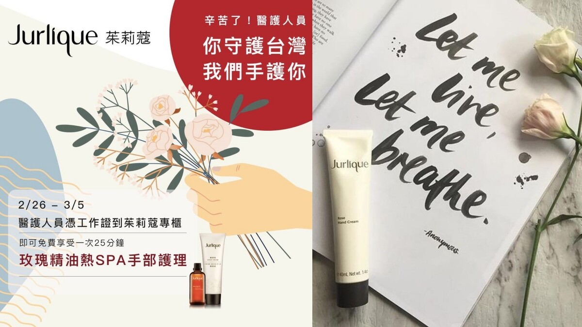 感謝全台醫護相關人員在防疫非常時期鎮守崗位,Jurlique自2月底起推出免費服務「25分鐘玫瑰精油溫熱SPA手部護理療程」,透過薰衣草精油淨化手浴、指緣修護、以玫瑰身體油與玫瑰身體乳進行深層按摩、將雙手放進專屬溫熱護手套中,微溫導入活機植萃能量至肌膚深層、最後再擦上玫瑰護手霜等5道手部保養步驟,紓緩緊繃筋絡,讓醫護人員享受難得的放鬆片刻在非常時期齊心前進。