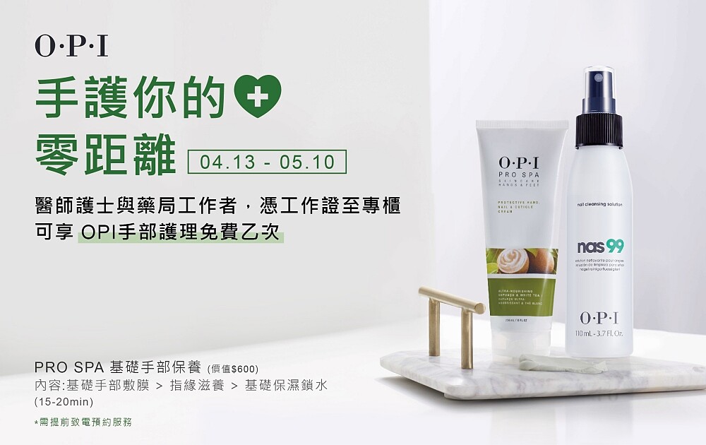 活動方式:凡醫護人員與藥局工作者,憑工作證至OPI直營門市及專櫃,即可享OPI PRO SPA 基礎手部護理保養乙次(請提前致電現場預約時間,到場後出示工作證/名片後即可進行免費手護理保養)