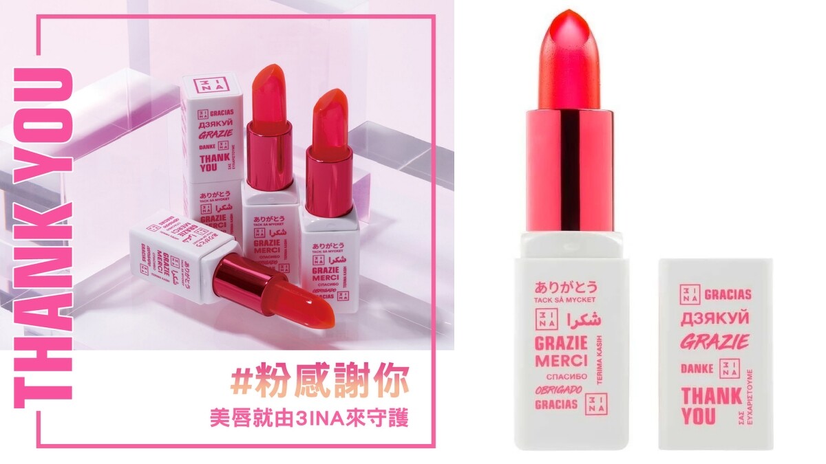 為感謝全台醫護工作者,3INA特地為醫護人員送上特製的「粉感謝潤色護唇膏」,外殼印有英文、日文、西班牙文等各國語言的「感謝」字樣,表達對醫護人員衷心的感激。護唇膏則添加天然保濕鎖水因子、柔嫩修護美唇精華,呵護醫護人員因全天戴口罩而乾澀缺水的雙唇。
