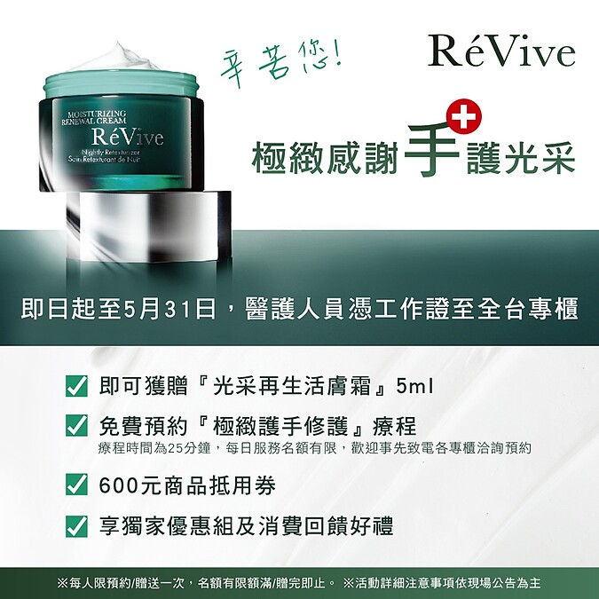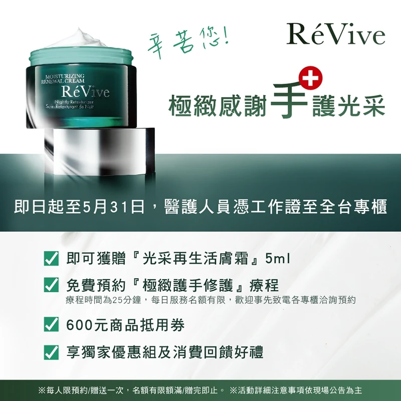 活動方式:醫護人員至全台任一RéVive專櫃,出示醫護人員工作證,即可享有免費專屬極緻護手修護療程(療程時間25分鐘,每日服務名額有限,歡迎事先致電各專櫃洽詢預約),更可同時獲贈經典明星商品光采再生活膚霜5ml、600元商品抵用券。不限金額消費即贈「4D美膚體驗組(內含全效複合抗氧精華3ml+4D緊膚美體霜10ml)」,還可以醫護人員專屬限定特惠購買「守護光采煥膚組」(光采再生活膚霜50ml、白晶煥膚面膜75ml、光采再生賦活眼霜15ml,價值NT17,400、優惠價NT12,200)。