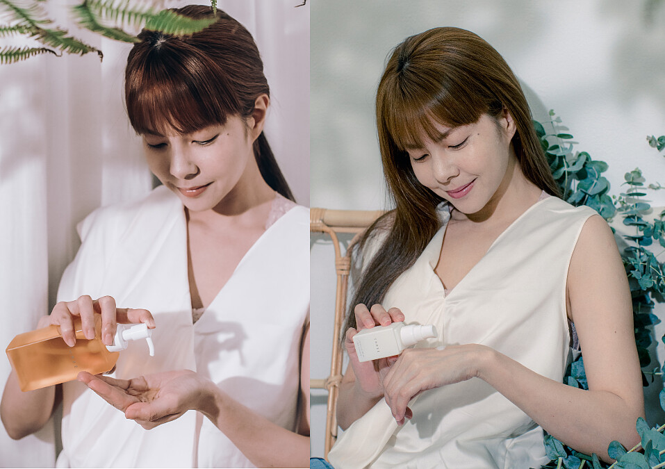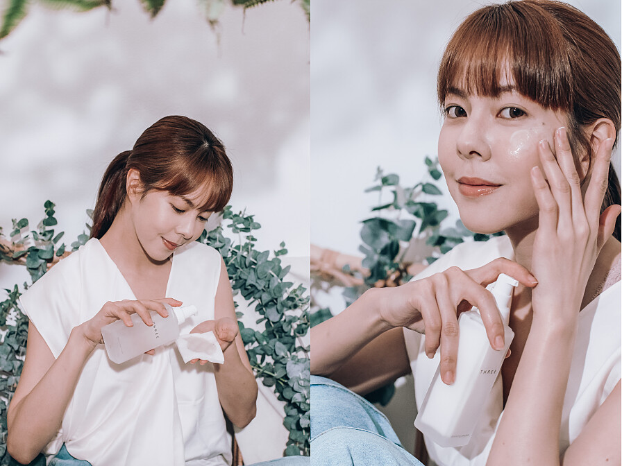 THREE平衡系列訴求喚醒肌膚原有平衡的基礎保養,高濃度的天然植萃成分,搭配獨家調配複方精油,賦予肌膚潤澤彈力,透過嗅吸還能夠放鬆、安定心靈。熱賣人氣王「THREE平衡潔膚油R」,Ruby的使用感受是卸妝快速,能夠輕鬆的將彩妝卸乾淨,療癒的香氣讓人著迷。卸妝之後,先用「THREE平衡淨白精華液」先潤澤肌膚,讓後續保養更好吸收,其中天然美白成分-熊果素,以不刺激的方式,讓肌膚原生地透亮,接著使用「THREE平衡水凝露R」,她一定都會搭配化妝棉,充分浸潤後再濕敷,更特別提醒用量真的不要省,保養起來才更有感,最後使用「THREE平衡水凝乳R」,內含獨家日本原料植物純露成分,幫助肌膚快速導入吸收。極簡的包裝設計,擺放在化妝台上,看了心情也特別療癒。