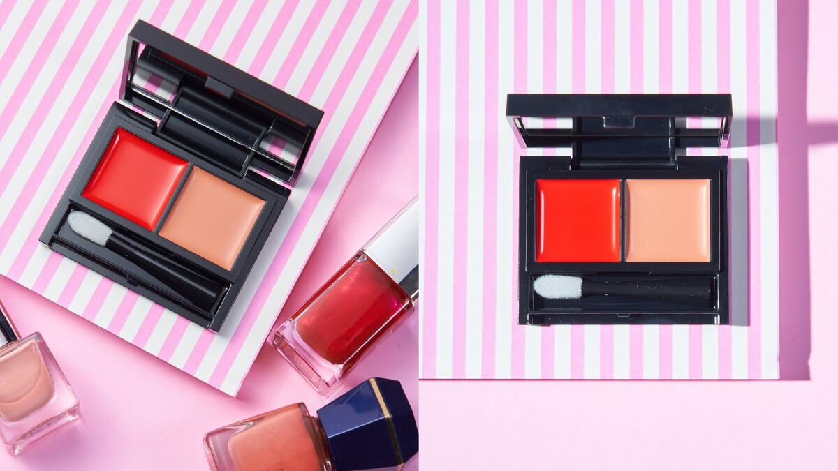 「赤裸混色唇彩盤」結合潤澤乳霜質地的2色唇彩,左邊為”高飽和度紅色系底膏”,能打亮唇瓣、遮飾唇部暗沉、凸顯唇型。