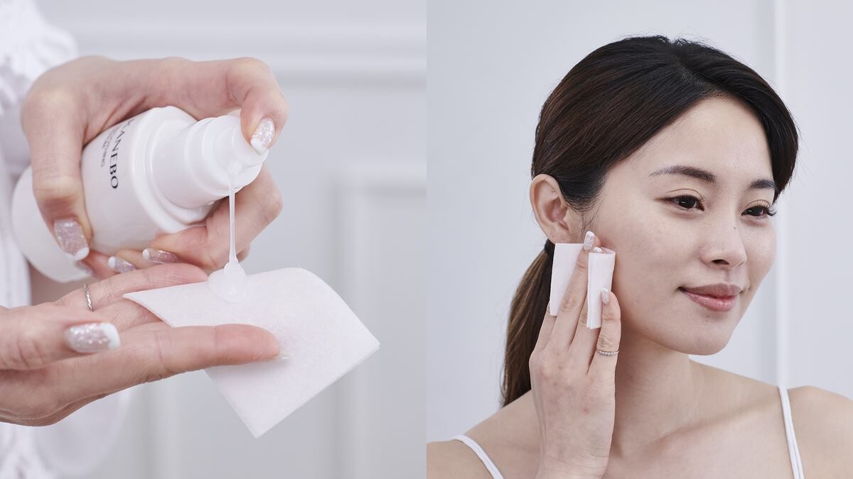 當肌膚油水失衡時,大家都會想到去角質,但正值換季肌膚較敏感,陳欣欣選擇溫和的美妍角質美容液,柔滑的水凝乳質地,倒在化妝棉上,以畫圈的方式擦是全臉,輕鬆的去除老廢角質,肌膚摸起來會很柔嫩細緻!