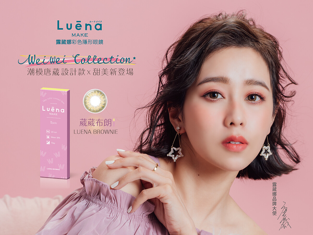 來自日本的Luēna露葳娜彩色隱形眼鏡品牌在2018年於台灣上市,一直不斷地把日本最流行的彩拋片款式引進到台灣,讓台灣消費者可以不用出國,就能同步買到與最受日本女孩歡迎的彩拋片。而在今年露葳娜品牌為了深根台灣市場,與台灣知名潮模-唐葳合作開發全新彩拋片,融合日本最新流行的透明感印染設計加上唐葳自己在彩色隱形眼鏡上的獨到想法與巧思; 經常使用彩拋片的她知道台灣女孩對於彩色隱形眼鏡的需求,因此將這些想法與經驗融合展現在這次設計的聯名系列-[Wei Wei Collection],打造全新兩款彩色隱形眼鏡: