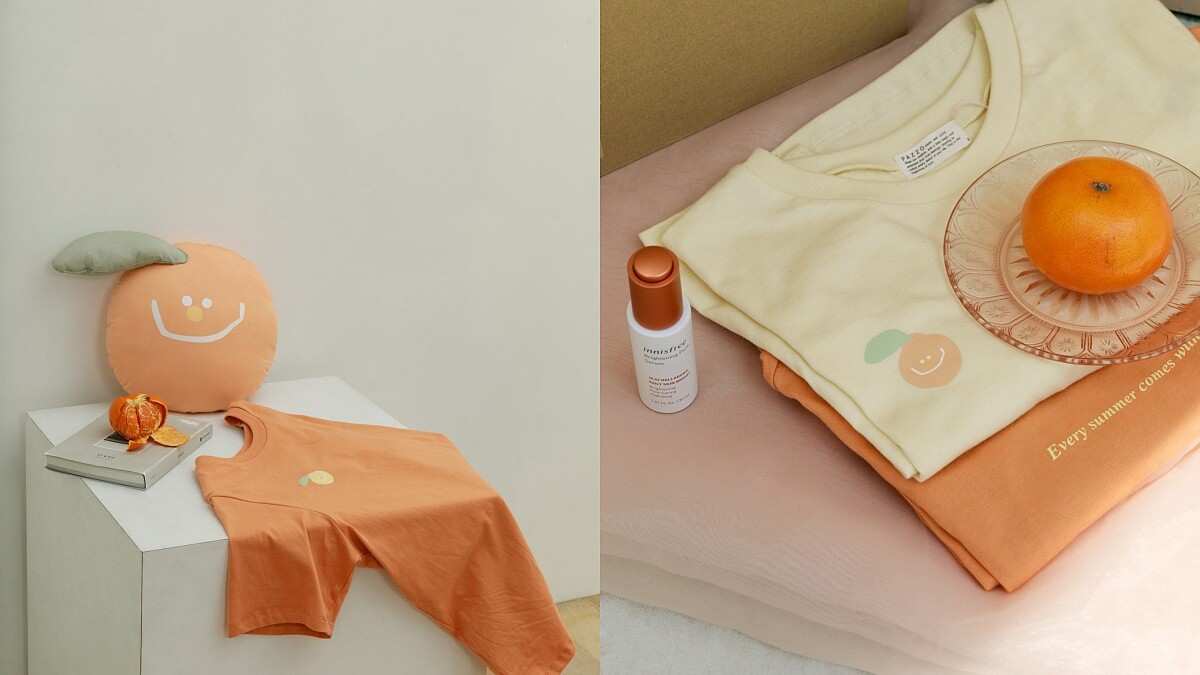 innisfree今年也攜手台灣電商服飾品牌PAZZO推出聯名商品,結合innisfree 2020年4月新上市的漢拏山柑橘C亮白系列,將超Q的柑橘實體化推出聯名 T-shirt及抱枕!