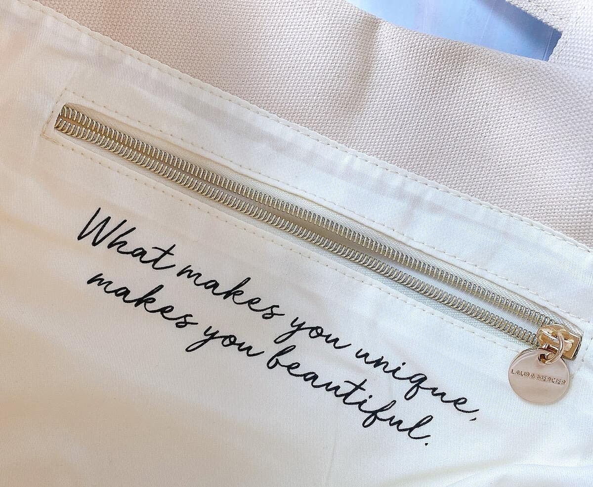 包包內部細節處也很精緻,印有LAURA MERCIER的金句 “What makes you unique makes you beautiful.” 。超大容量連大條浴巾也能裝入,最適合作為夏日去海灘的實用包款,也趁時幫底妝補貨。