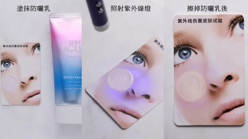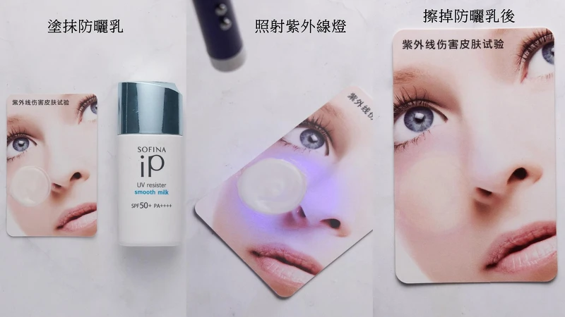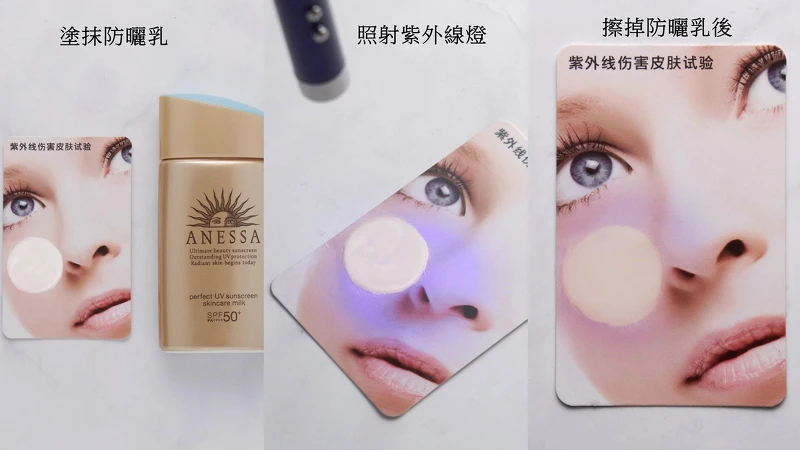 把防曬乳均勻塗抹於紫外線測試卡上→用紫外線燈照射30秒後→擦掉剛塗抹的防曬→就可以看出有塗防曬&沒塗防曬的差異性。