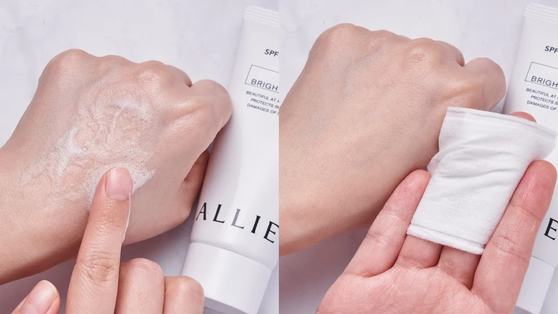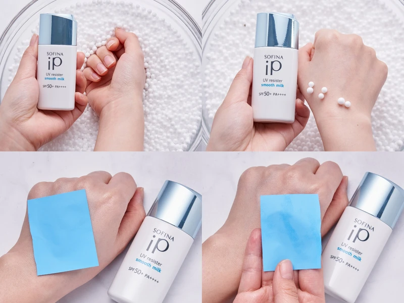 有塗抹防曬的手伸入保麗龍球中,沾黏愈少愈不黏膩。過一小時後,再用吸油面紙按壓,可以看出清爽度的維持力。