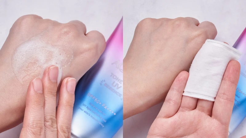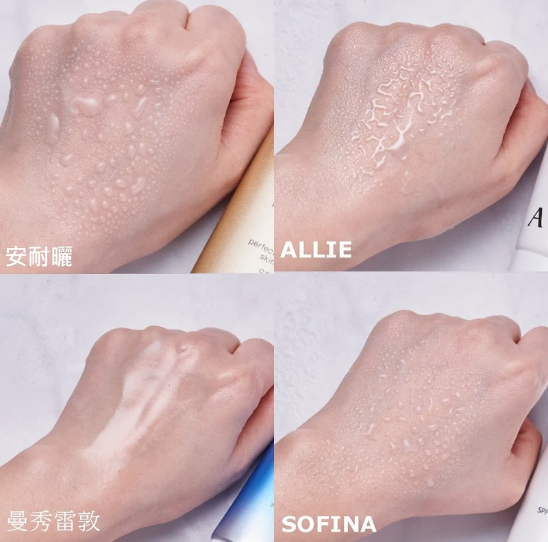 在塗抹防曬的手背噴上大量的水,可以看到明顯水珠聚集者的防水抗汗能力愈好。