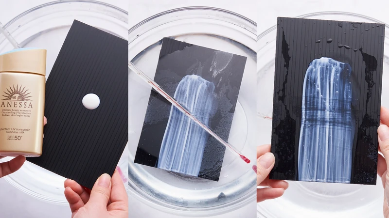 將安耐曬小金瓶塗抹在黑色瓦楞板上,並浸泡在超過40度c的水裡模擬炎熱的氣溫,發現防曬乳依舊不脫落,不只超強防水、還能抵抗高溫,果然是地表超強防曬沒有之一。