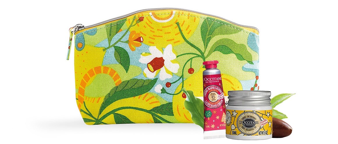 3.消費滿NT5,400:豔夏果漾馬鞭草化妝包、夢想乳油木花果舒芙護手霜10ml、節慶乳油木清茶舒芙身體霜50ml