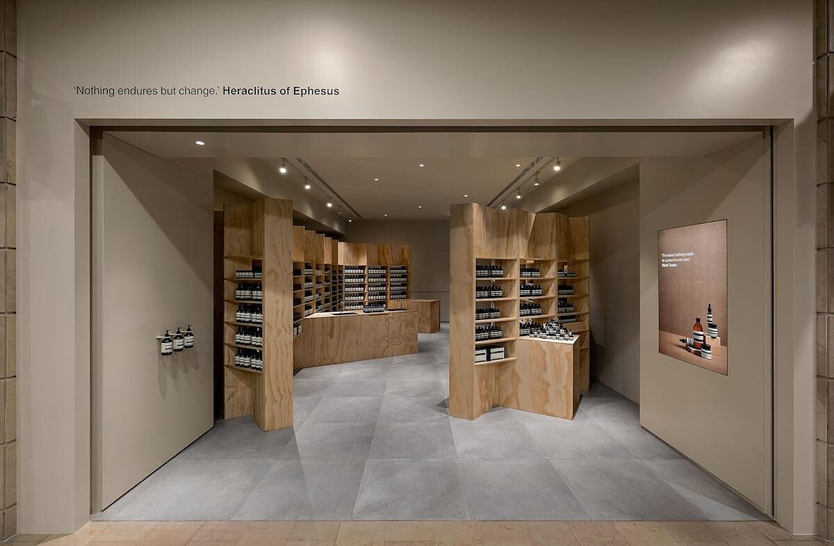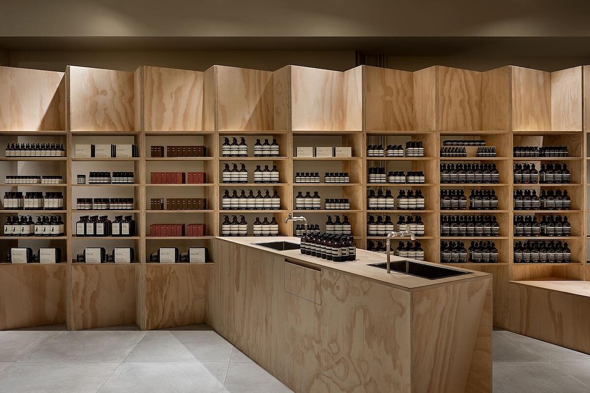 在店鋪設計上始終以在地與永續設計為優先考量,Aesop新竹店便是以100%回收再製的棕色玻璃製成的卵石加入水泥砂漿,打造出質樸天然的內部空間。