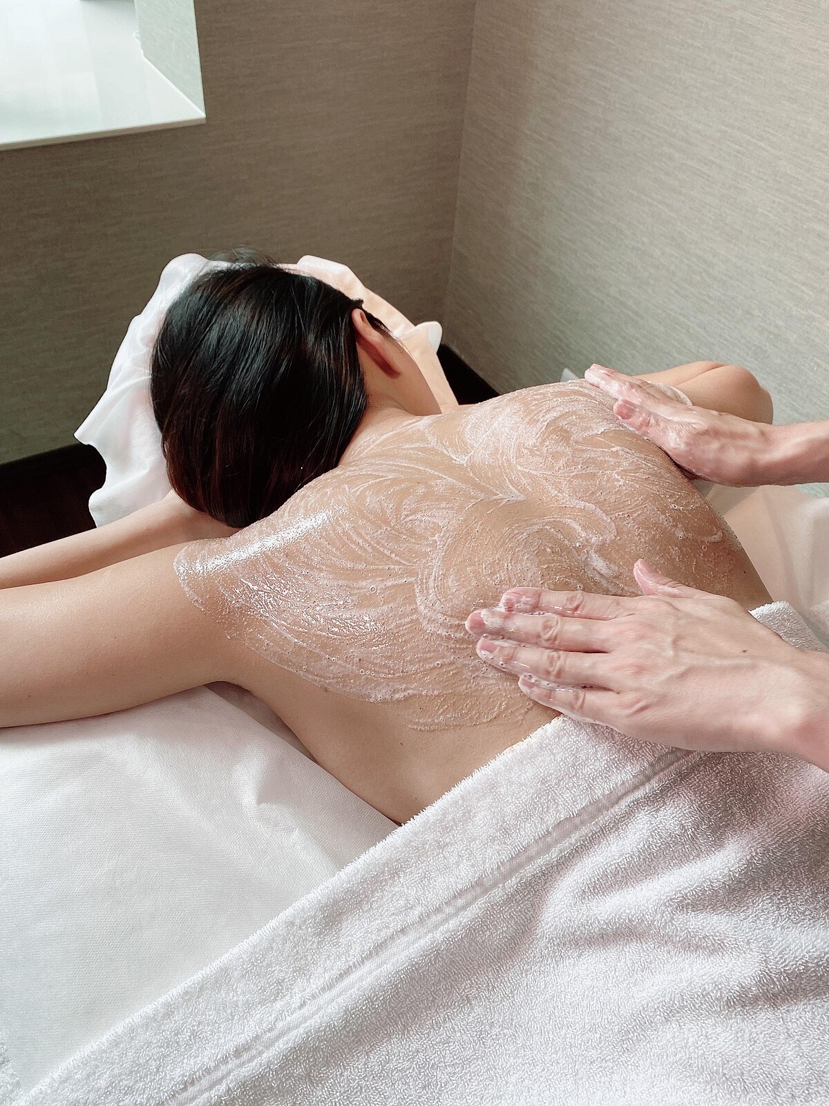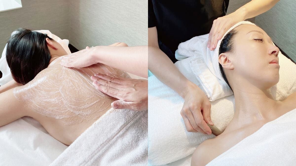 另一款全新「優格美背磨砂課程」是以天然優格結合英國皇家經典芳療品牌Aromatherapy Associates(AA)玫瑰沐浴露、磨砂微粒,幫助溫和代謝背部肌膚老廢角質並柔軟膚質、提升肌膚水潤度,芳療師表示:「這個優格是我們自己發酵的喔!絕對天然。」