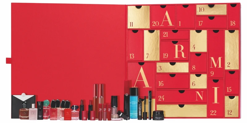 一年一度亞曼尼彩妝迷最引頸期待的聖誕倒數月曆換上全新包裝隆重登場,今年以最著名的亞曼尼紅與金色作為倒數月曆主要色調。內容更超值加入多款正貨,包含兩款奢華絲絨訂製唇萃-韓國熱賣番茄色#405緋紅禮帽、溫柔甜美可人#102拿鐵玫瑰,以及決戰時尚釉黑睫毛膏、設計師綻色眼彩露等眼妝產品,此外還能獲得限量質感黑色的亞曼尼精巧隨身鏡、亞曼尼小香水、多款亞曼尼唇彩迷你版,每一天都有GIORGIO ARMANI帶來聖誕倒數的驚喜期待。