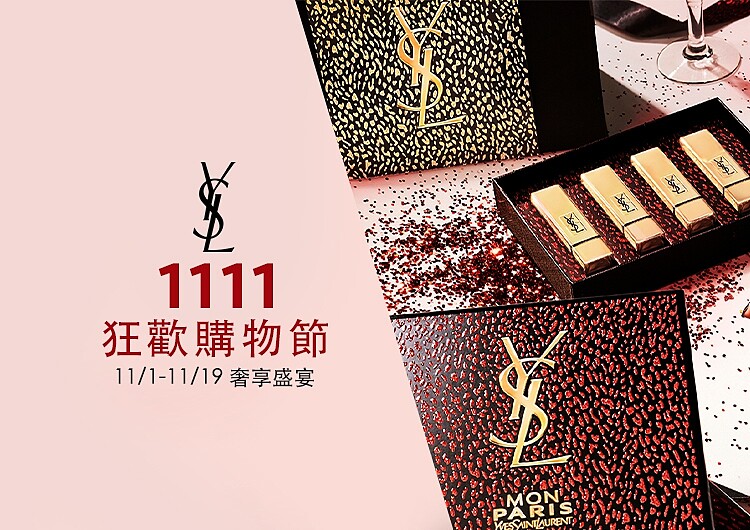 為歡慶官網1111狂歡購物節,YSL啟動最火辣、熱烈的優惠。註冊即享會員專屬優惠, 11/1~11/19期間每筆訂單不限金額天天輸入折扣碼,立即獲得不同獨家限量禮贈。同時全網購買任2件底妝即享彩妝4件禮,完全引爆購物高潮。
