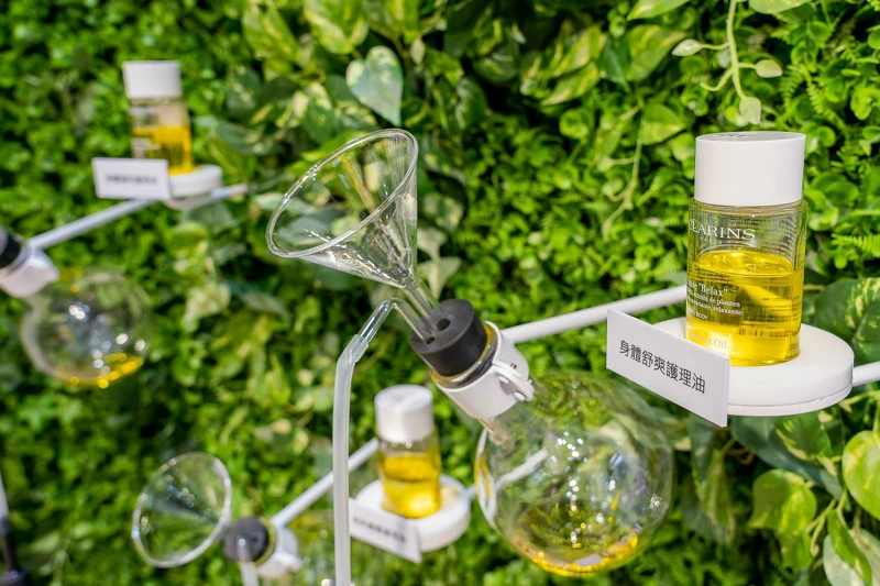 從快閃店入口開始,就設計了圓弧型沙發休憩區,輕鬆就能拍出打卡每照,場館內左右兩側設有嗅香區,靈感來自法國羅浮宮香水舖,透過擠壓注入空氣於容器,讓你能夠優雅的享受克蘭詩油保養的天然植物方香。
