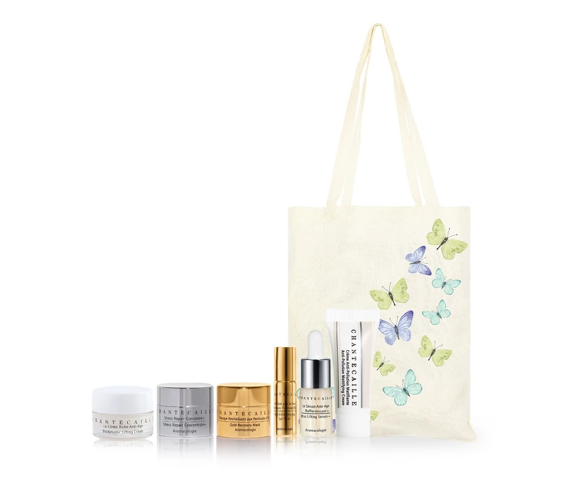 單筆消費滿NT$28,000,即可獲得極緻純金賦活眼部精華液3ml、鑽石級眼霜+升級版3 ml、鑽石精華液+升級版4ml、極緻純金賦活面膜5ml、鑽石級乳霜+升級版5ml、抗汙染防護乳液8ml、蝶舞翩翩手提袋