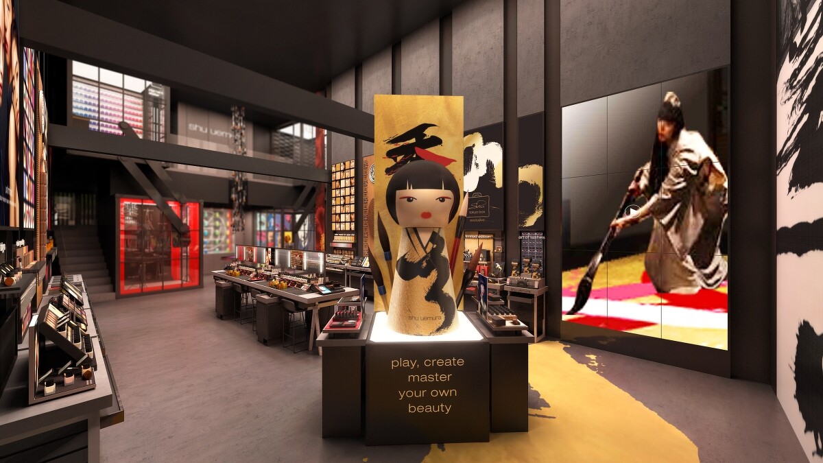 走進店面馬上可以看到大型的傳統日本人偶「木芥子」,源自日本東北,手工以高級木頭打造,是工藝的代表,傳統上都是由藝術家彩繪再署名。旗艦店裡的秀秀木芥子(shu shu kokeshi)則以黑色與金色的書法裝飾,象徵旗艦店的創意與藝術特質。少了彩妝師的雙手,化妝箱就不具備意義,而這個木芥子就代表著伴隨shu tokyo makeup box的彩妝師。
