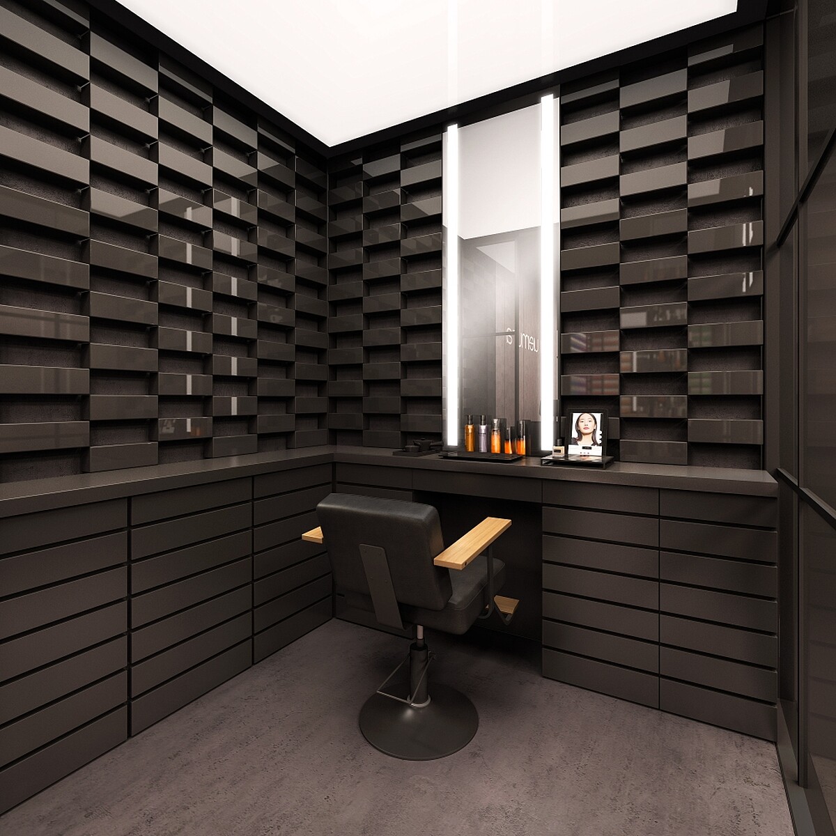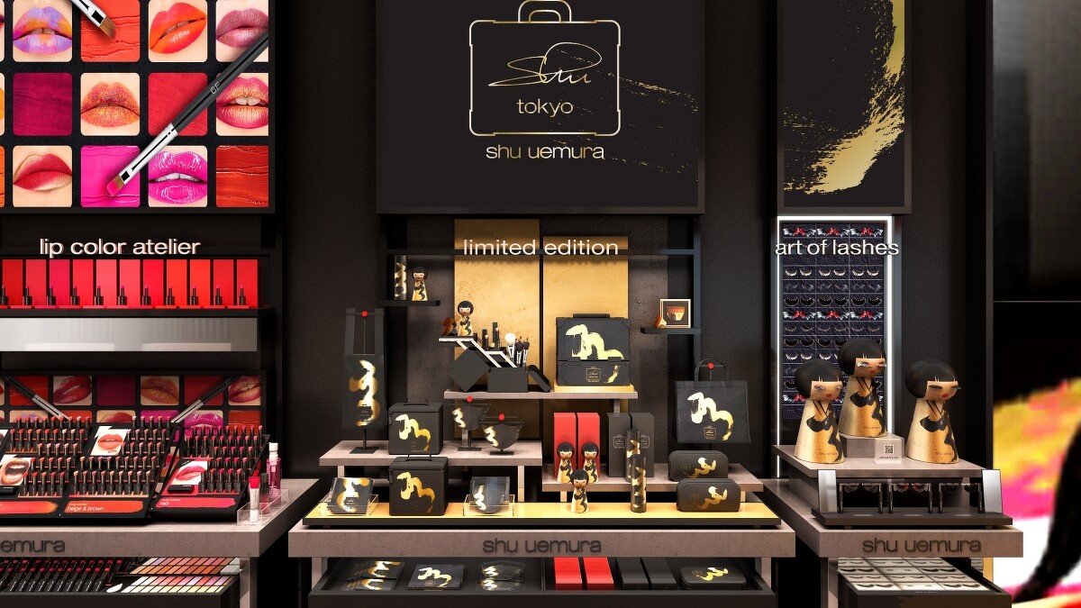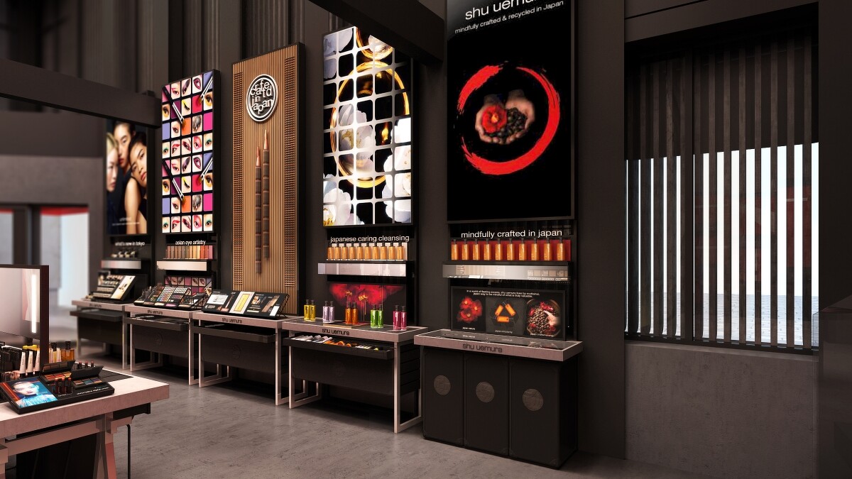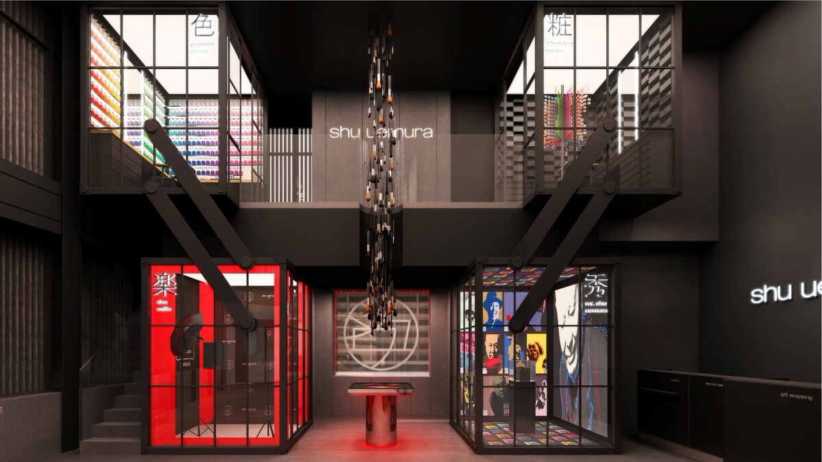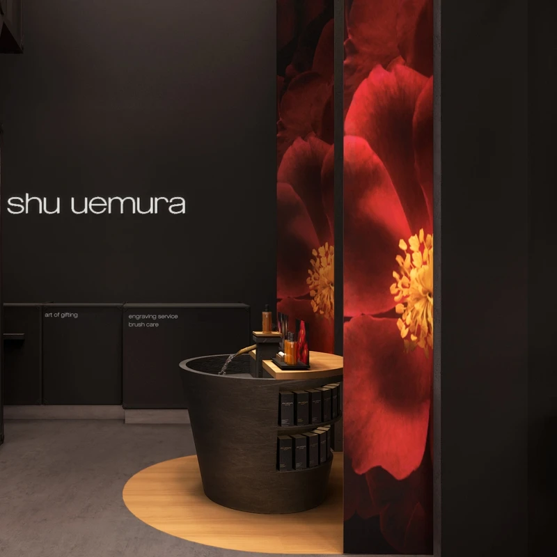 這間店以植村秀先生的化妝箱為靈感設計,是植村秀彩妝精品店的全球旗艦店。因為「化妝箱」可說是改變了植村秀先生的一生,1950年代初期還是學生的他在美國電影《 joe butterfly》 拍攝期間被好萊塢劇組發掘而開始職業生涯,植村秀先生曾說:「當我第一次打開裝滿好萊塢彩妝品的化妝箱時,我感覺彷彿有一道光打在我身上,而我就像是找到裝滿金字塔寶藏的箱子一樣。」這段好萊塢初體驗,就是植村秀先生日後以創意、堅持及開創精神造就之生涯與故事的里程碑。