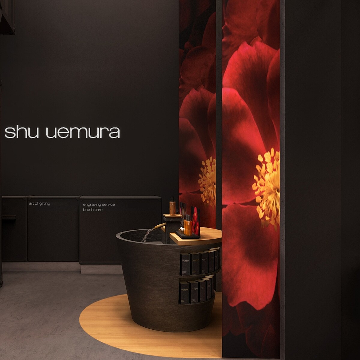 潔顏油一直是植村秀品牌的核心,彩妝精品旗艦店裡特別設置一座以溫泉為靈感的石製洗臉台,營造出以豐島(潔顏油最重要成份-山茶花的發源地)為靈感的氛圍。植村秀彩妝師會搭配指壓按摩示範產品,提供令人放鬆的手洗示範體驗。