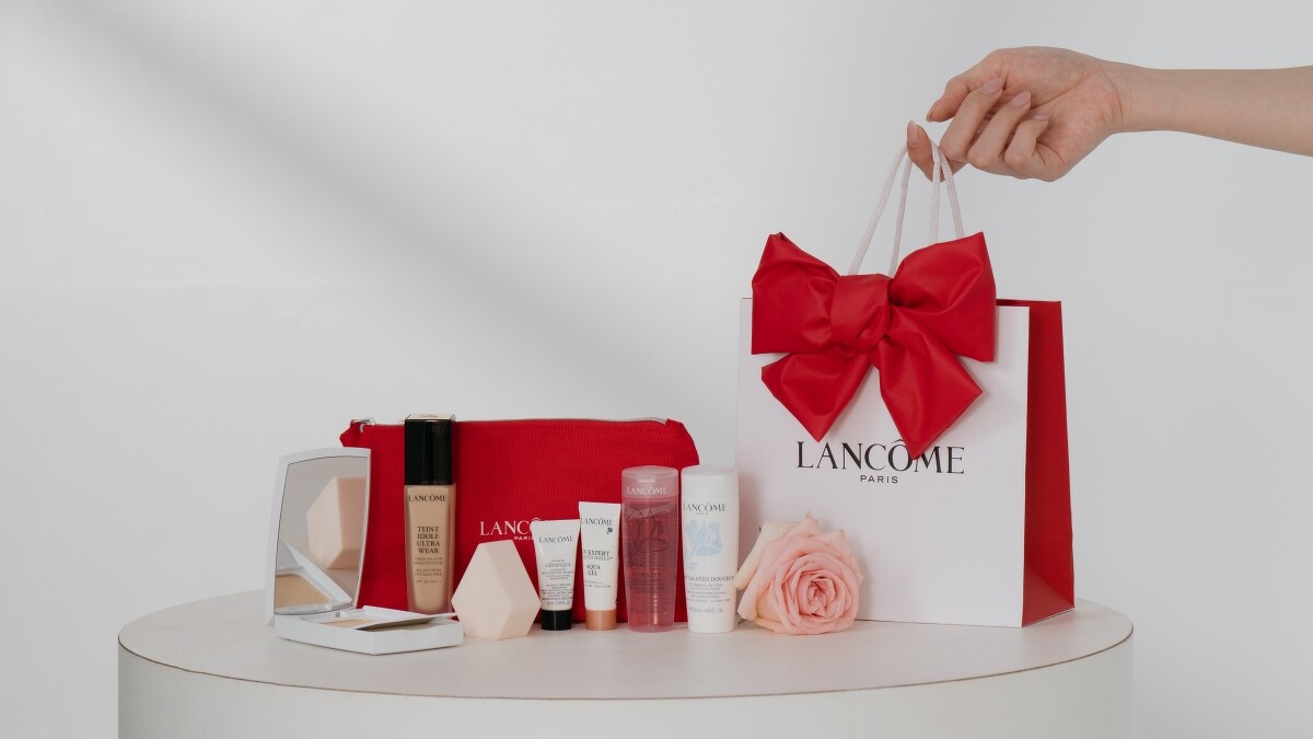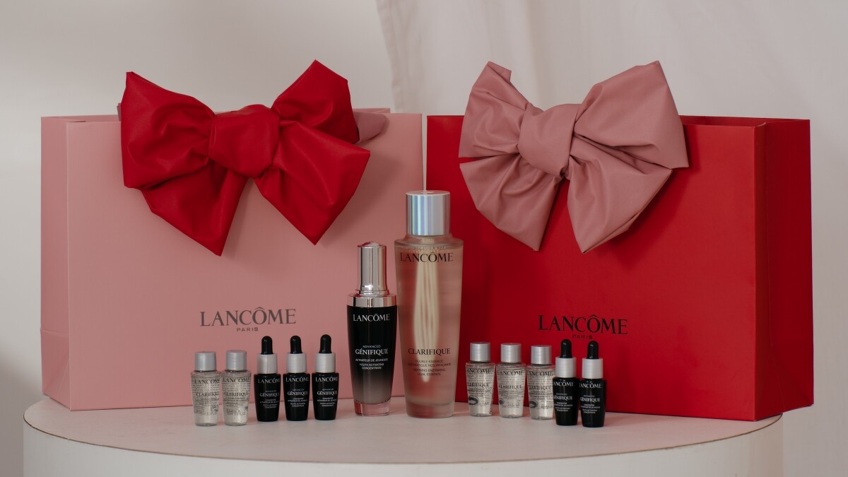 「高級訂製蝴蝶結禮袋」,華美的手工蝴蝶結設計於緞帶提把上,讓禮袋宛如手腕上的最美風景,共推出粉、桃兩款色選,舉手投足間散發優雅氣息。主打推薦蘭蔻最強嫩亮神器「極光水」超極光活粹晶露、「小黑瓶」超未來肌因賦活露兩款入門特惠組?