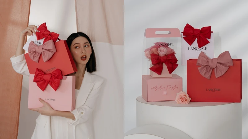 「蝴蝶結擴香包裝禮」,以緞帶打造的蝴蝶結擴香, 點綴於蘭蔻禮袋上,象徵與母親、閨蜜或情人間的甜蜜「香」遇。商品推薦蘭蔻口碑底妝-零粉感超持久粉底,以及超極光精華水粉底系列產品。