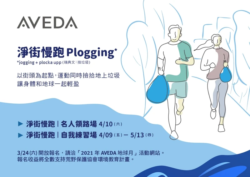 Plogging是由瑞典帶起的新運動風潮,結合了瑞典文「撿拾plocka」與「慢跑jogging」,在健走及慢跑同時間歇性地撿拾地上垃圾,鍛鍊身體同時維護生態環境。2021年AVEDA與街頭路跑創辦人胡杰合作,舉辦地球月「淨水任務 | 淨街慢跑」活動。