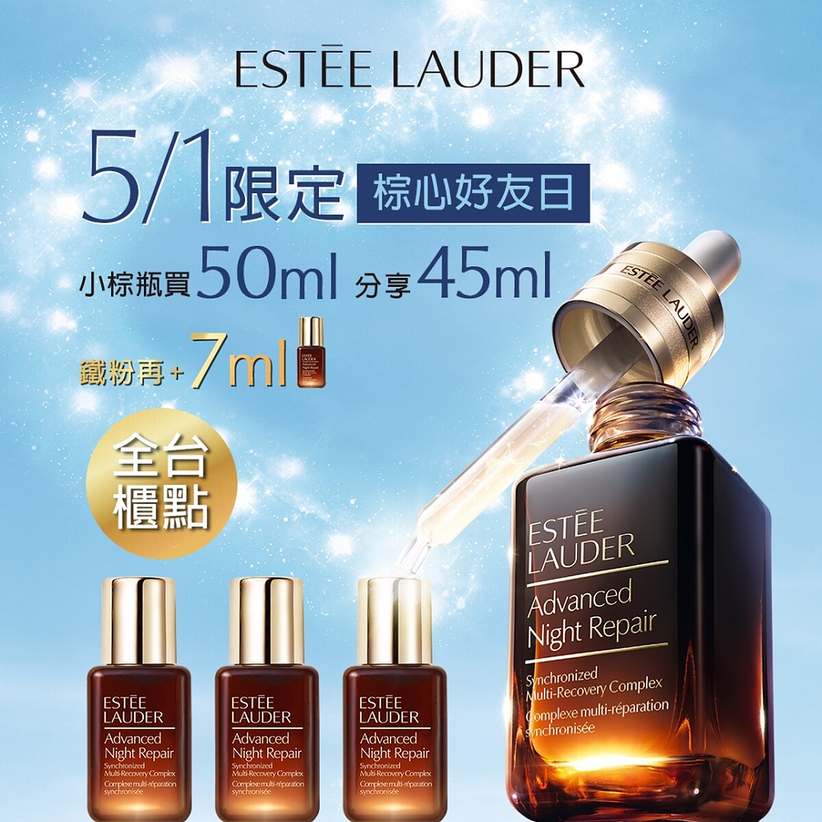 內容:當日於官網購買「全新小棕瓶50ml」一瓶,雅詩蘭黛即分享「全新小棕瓶50ml」一瓶(也就是總共可以得到50ml+50ml)!