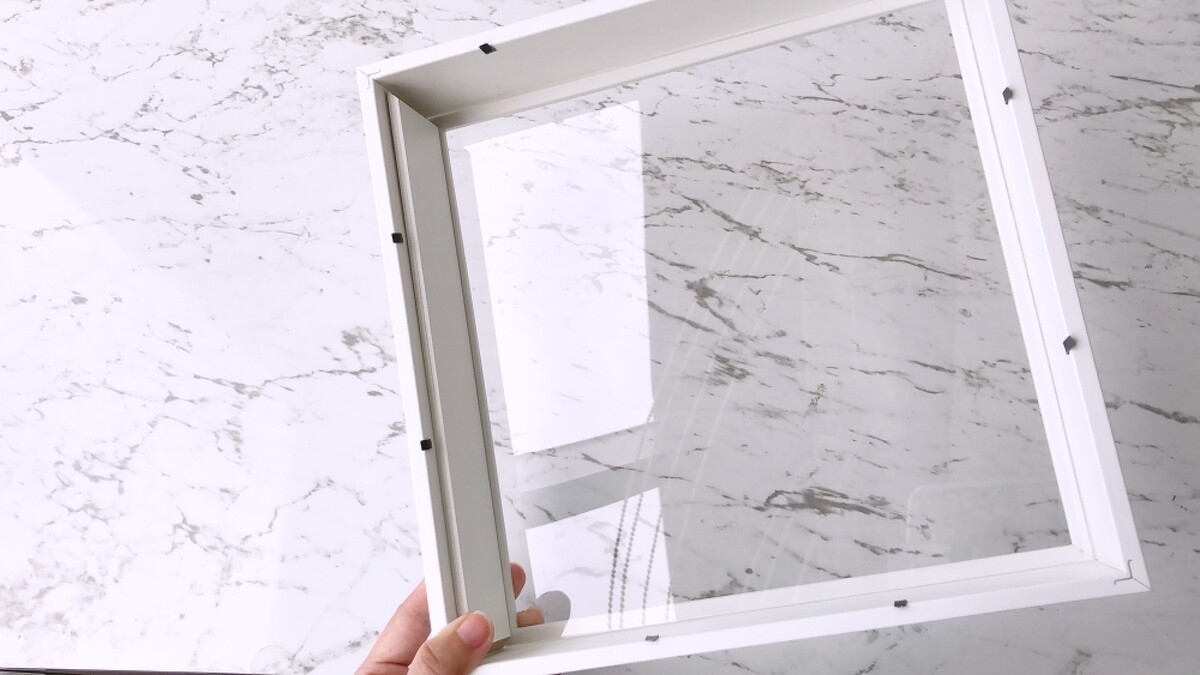 拆掉封膜後打開背板,取出相框裡面原本就有的紙張、透明膠片以及最重要的內框。
