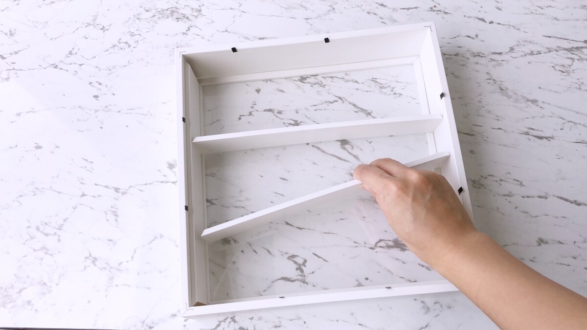 最重要的步驟來了!將其餘的二或三個木條,視自己需求,「橫向」塞回相框中,間距可依自己需求調整,這就是展示的層板。