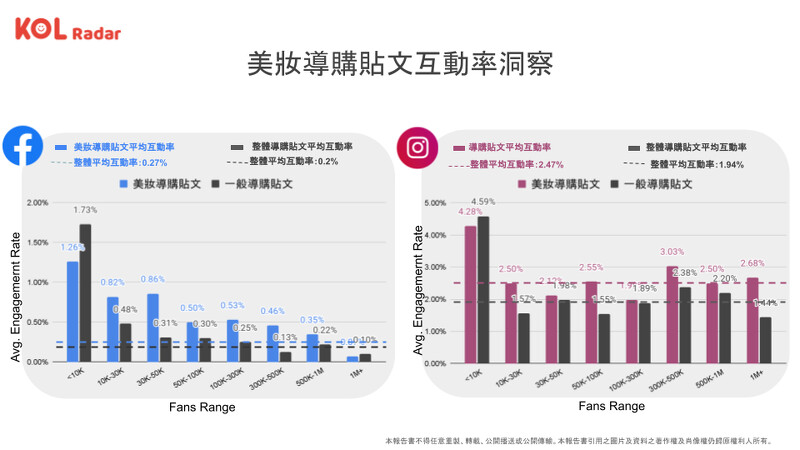 根據 KOL Radar 調查發現,美妝產業在社群中具有高度轉換目的之「導購型」貼文,僅佔台灣整體導購貼文的極少數—— FB 僅佔 5.5%、IG 則僅 3.1%。不過根據網友互動成效反饋,美妝導購貼文的互動率不論是在 FB 還是 IG 皆超過台灣整體導購貼文的平均互動率,充分展現大眾對於美妝產品導購的關注及興趣。