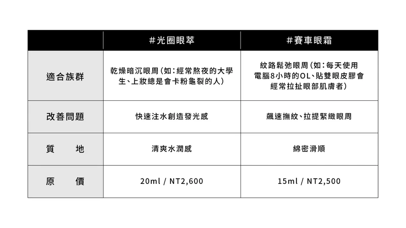 網友大推亮眼雙星#光圈眼萃+#賽車眼霜,交替用把陳年眼周問題一次解