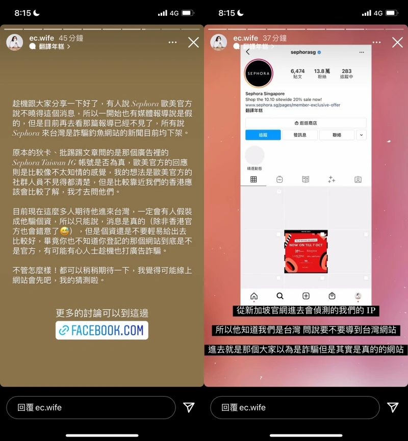 電商人妻在接下來的動態中也提到,先前有網友詢問Sephora歐美官方台灣的Ig帳號是否為真,歐美官方的回應像是不太清楚這件事,而電商人妻認為,歐美的社群人員可能並不完全了解這個狀況,所以轉而詢問Sephora香港。同時,如果從新加坡、馬來西亞、泰國Sephora的ig帳號點開網址,會被偵測IP且詢問是否要跳轉到台灣網站?且也有網友提供截圖,Sephora的列表中已經加入了台灣,更進一步證實了Sephora登陸台灣的消息。