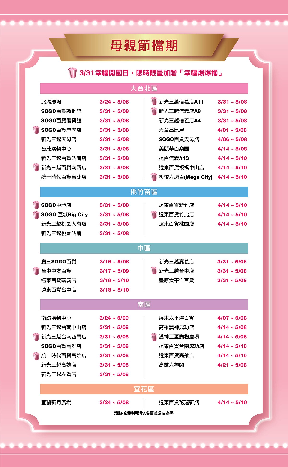 ※幸福爆爆桶限定櫃點:新光三越台中中港店、SOGO忠孝館、板橋大遠百、遠東巨城購物中心、高雄漢神巨蛋、新光三越南西店、台中中友百貨、SOGO百貨中壢店、新光三越台南西門店、新光三越信義A8、新光三越信義A11、遠東百貨竹北店、統一時代百貨高雄店 (*幸福爆爆桶每人限贈一個)