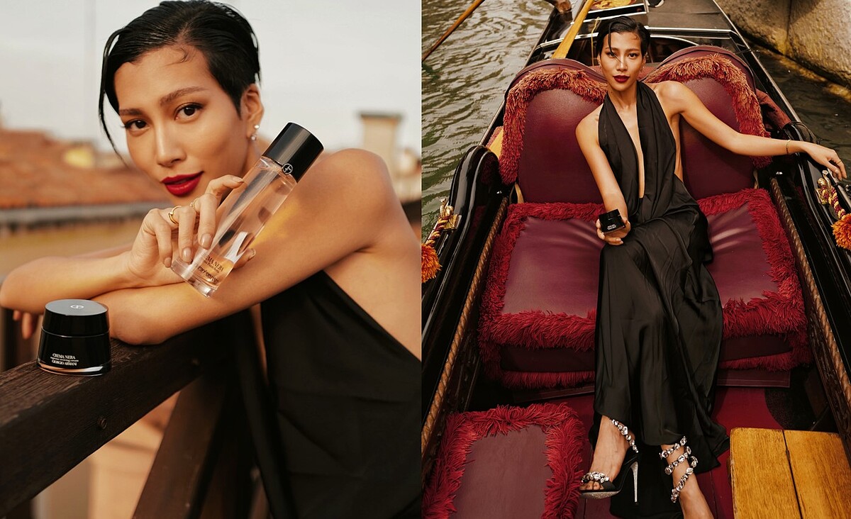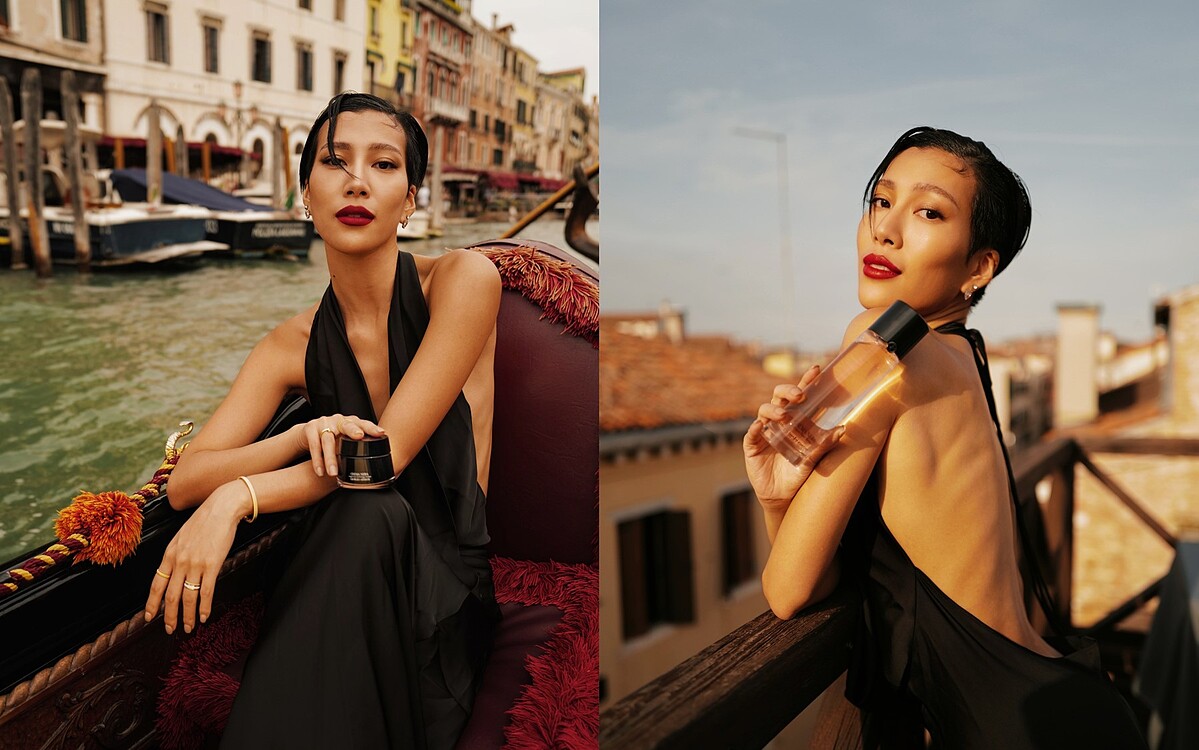 莫莉說道:「旅行期間,有了亞曼尼黑曜岩黑霜+粉水的加持,真的幫了我皮膚很多忙」身為超級保養控、亞曼尼黑曜岩保養愛用者的莫莉,這回來到亞曼尼的故鄉義大利,在暢遊威尼斯期間,特別在著名的貢多拉船上為亞曼尼黑曜岩頂級保養拍攝奢華美照!莫莉以一席黑色華麗長裙,大展超精緻滑嫩膚質,夕陽下的她,肌膚大透耀眼光澤,美得驚豔;而對莫莉來說黑曜岩保養系列如旅人搭上貢多拉,是場人生奢華的體驗、那種美,令人屏息!