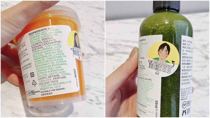 Lush所有產品都可以在包裝上看見完整內容物,綠色的字體表示來成份來自天然萃取,若是特別標明「SP」則是成份本身即含有天然防腐功能,像是蜂膠、精油等。另外包裝上會有一個人物插圖貼紙,則是呼應全產品皆為人工製造,代表該產品由其製造、負責。