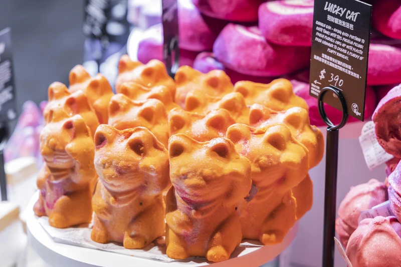 為慶祝 Lush 在台灣首家直營門市正式開幕,Lush 京站店獨家限量販售 2022 年虎年限定「幸運虎汽泡彈」(Lucky Tiger Bath Bomb),以金光閃爍的小老虎開啟 Lush 回歸台灣全新一頁。幸運虎汽泡彈滿載「Karma 和諧心靈」(舊名:冥想)的廣藿香、巴西橙精油香氣,有助於放鬆身體、提振心神,為夏日增添運氣、勇氣和冒險精神。