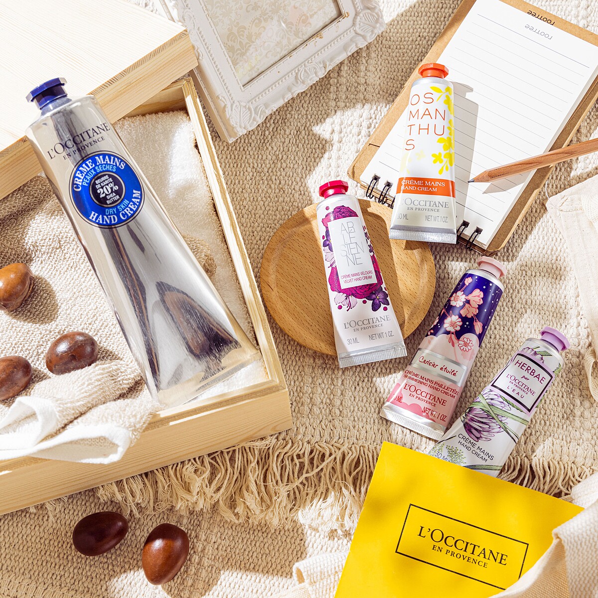 儼然是全球國民護手霜的歐舒丹,此生沒用過算白活,這回務必要下手,因為歐舒丹根本虧本販售,不到兩千就能擁有居家用的150ml乳油木護手霜,全家大小無人不愛的溫暖香味,連幼兒都會要媽媽幫忙擦擦的神極品護手霜,再加上四組熱賣30ml隨身款,揉和玫瑰、紫羅蘭、藏紅花的大人系亞爾緞帶護手霜,默默熱賣的原野之心花舞護手霜調和天使草、檸檬、茉莉的低調清香,超多OL愛用,容易雙手乾燥龜裂的人強力推薦必用桂花護手霜,特別的乳霜質地加上優雅融合桂花與檀香底蘊,潤澤雙手也無比暖心,最後的大驚喜就是限量新品夜櫻護手霜也在組合裡,少女心大噴發的浪漫味道愛死,包妳入手本組會驚覺:怎麼辦?原本想分送姊妹,現在全部想自留!