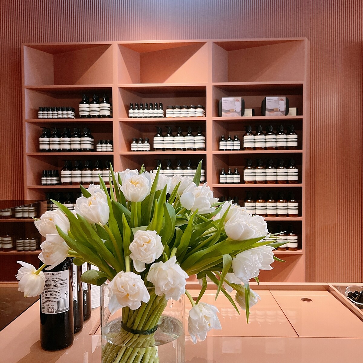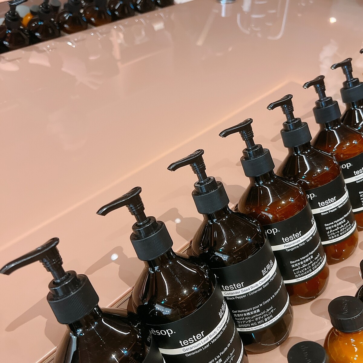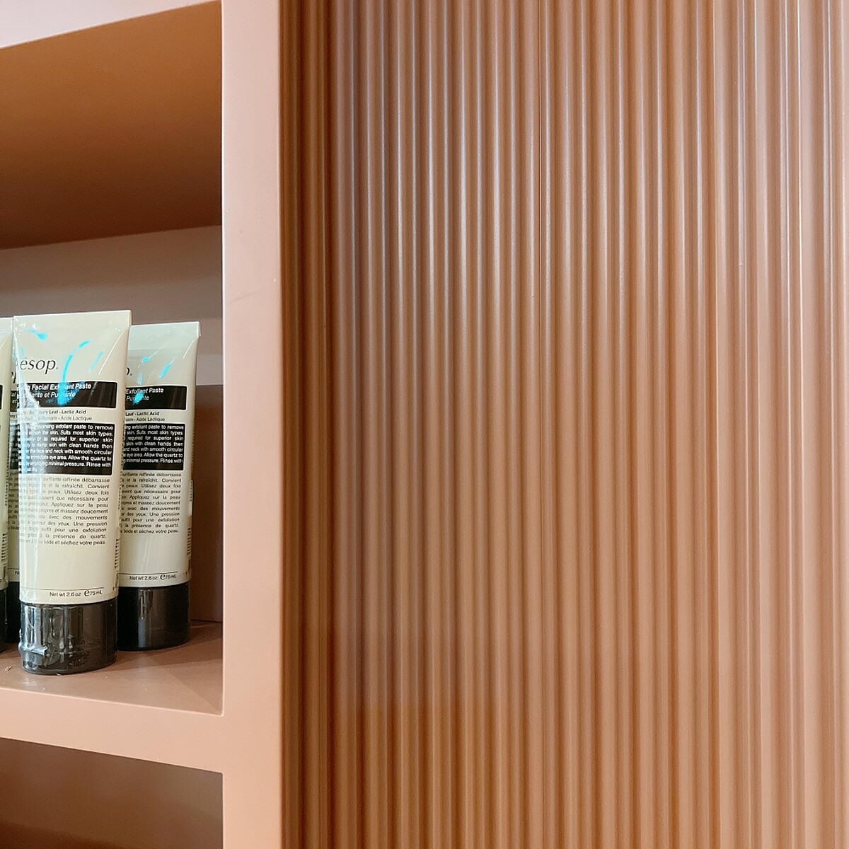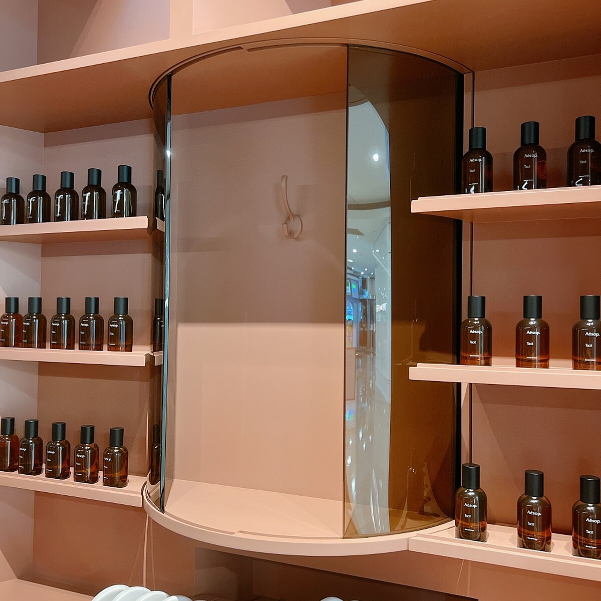 Aesop在台北101的店其實2020年就開設過,但當時偏向期間限定的概念,今年終於以正式店面亮相。整體色彩以粉橘色調為主,營造出有如「家」一樣的溫暖感。