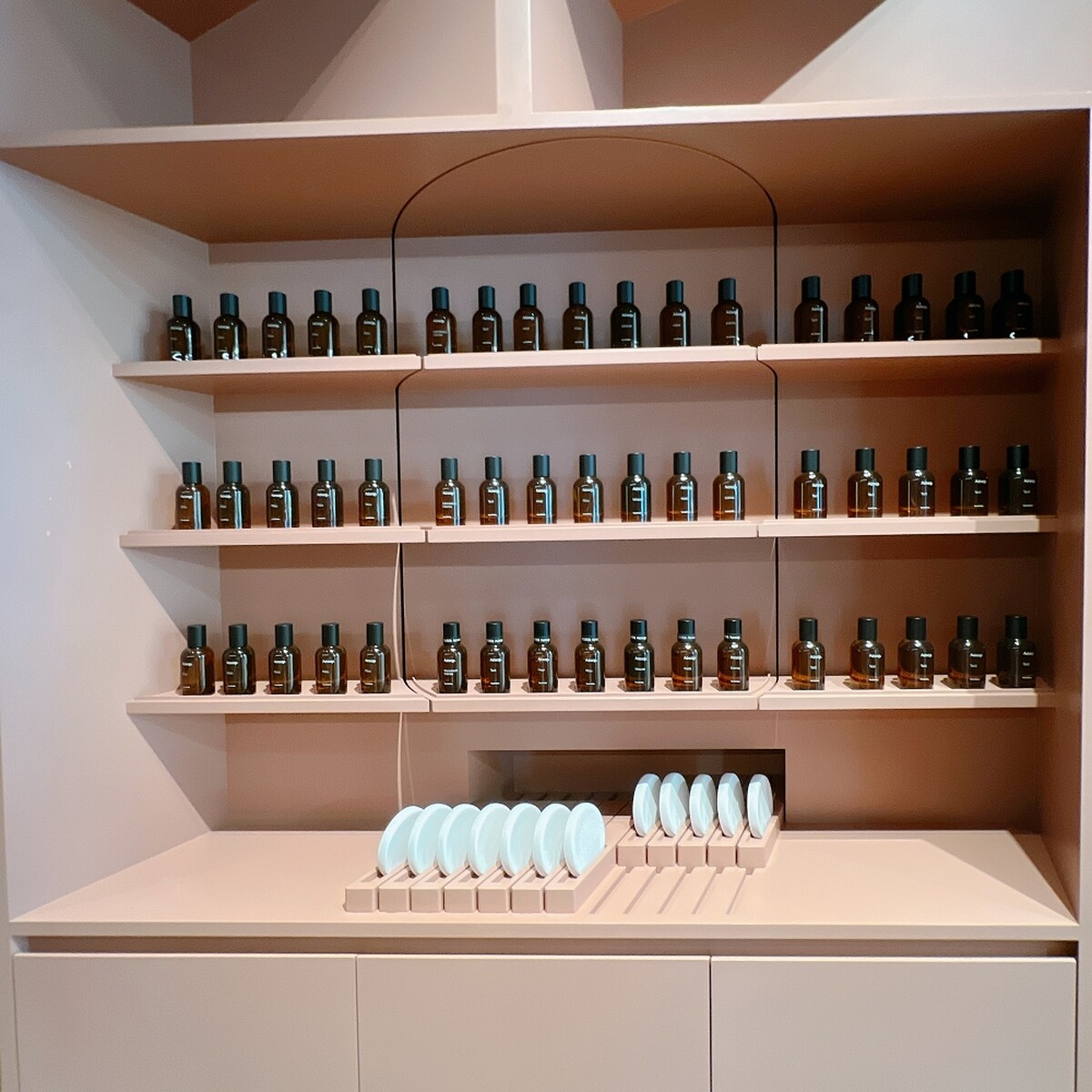 店中還有一大亮點,那就是進店後右手邊的有「藏香櫃」設計,主要是展示Aesop突破傳統框架的獨特香水系列,正面看是層架,背面則巧妙隱藏著一個可將香氣注入衣物的香氛轉盤。這個「藏香櫃」設計也是Aesop在台灣的首創。
