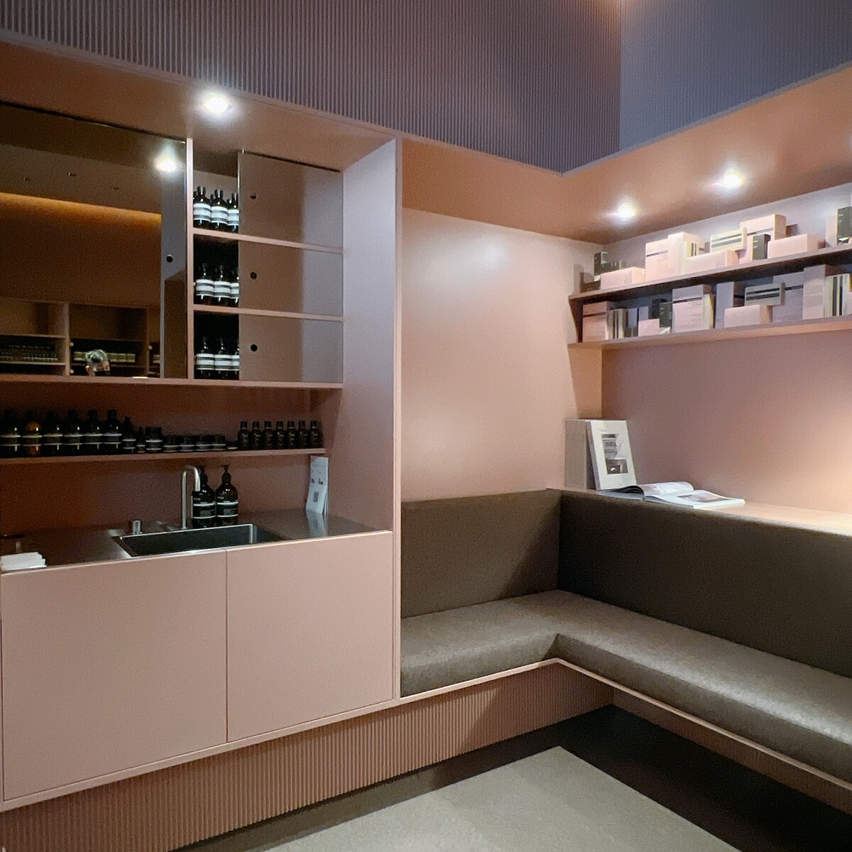 店中另外其中一個角落,可見一張嵌入牆面的長凳,提供人們寧靜的休憩時刻。