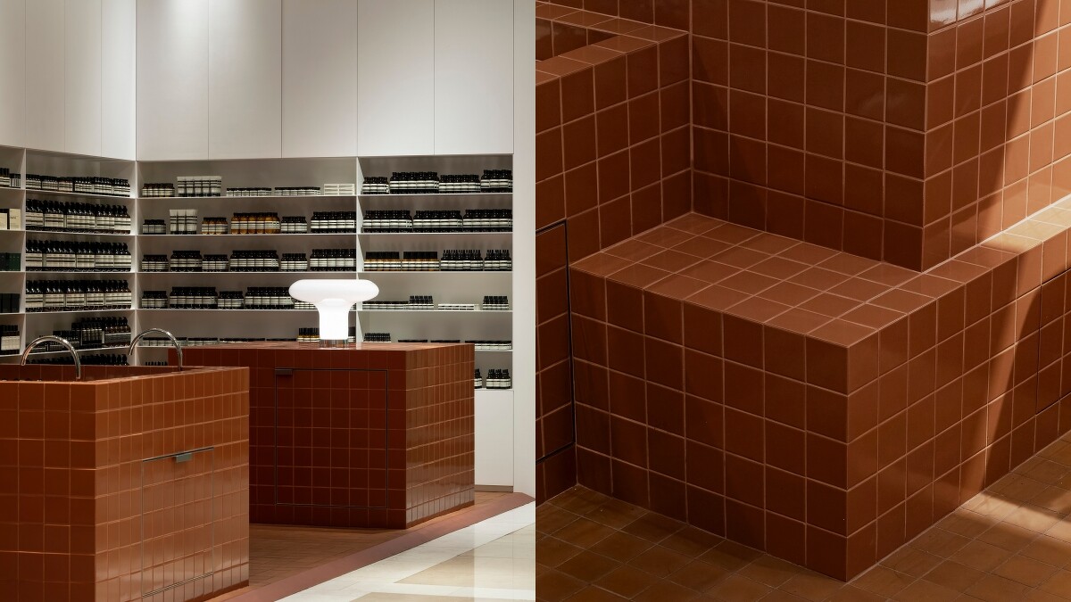因此Aesop設計團隊向台灣傳統建材與台南在地建築致敬,大量台灣在地手工製造的紅磚瓦。每一片皆由手工製作,顏色皆有所不同,但大小相同皆為100mm正方形。在地面上基於實用性以及安全的考量使用霧面材質,店鋪內其他牆面則使用亮面磚紅磁磚,創造材質與視覺上的層次感。