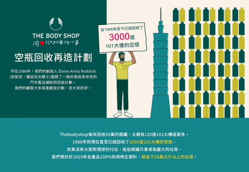 THE BODY SHOP全產品皆為國際全素認證、國際反對動物實驗認證,更是第一個實行「社區公平交易」的美妝品牌,目前95%的產品成份都來自世界各地弱勢族群,幫助落後社區及女性經濟獨立,包裝使用回收可再利用材質,且成份可被環境生物分解、不對海洋造成汙染,並預計於2025年全產品100%採用再生塑料。更從1988年起持續推動了33年的空瓶回收計畫,深受消費者支持,至今回收總量已超過3000座101大樓。因應即將到來的422世界地球日,THE BODY SHOP舉辦一系列活動,消費者不但可以省荷包,精打細算的同時還可保護地球。