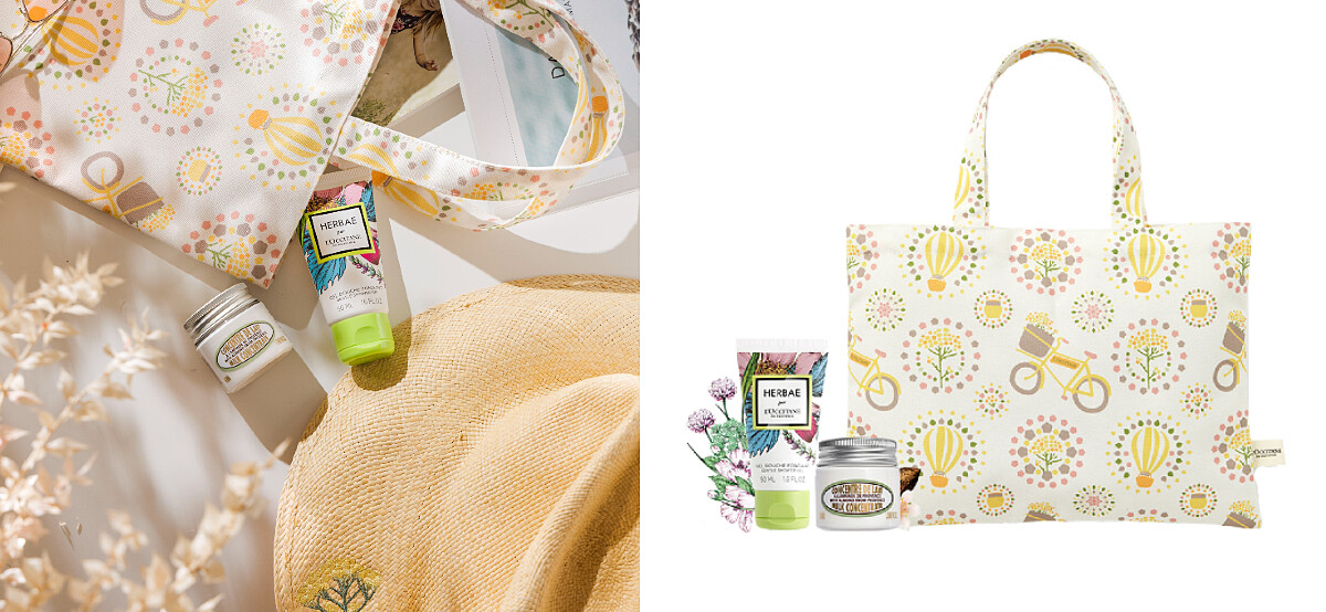 不只特惠組誠意滿滿,2022年母親節,歐舒丹L’OCCITANE 更與印花樂合作推出保特紗環保提袋,採用回收寶特瓶再製而成的環保保特紗,加上療癒的蠟菊、腳踏車及熱氣球等可愛南法元素插畫,讓人忍不住想天天攜帶使用,響應綠色環保生活!