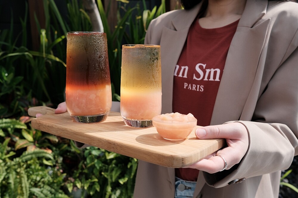而由彩妝延伸出的飲品「桃氣烏龍」就由喫茶小舖團隊研發,如同六色眼影盤同樣有著多層次的表現,蜜桃果粒口感結合醇厚手摘烏龍茶香,或是依照喜好選擇喜歡的基底茶(青山茉綠、烏瓦莊園紅茶、桂花烏龍、文山青茶等),一口茶、一口果粒,喝進滿滿的「桃氣」感!