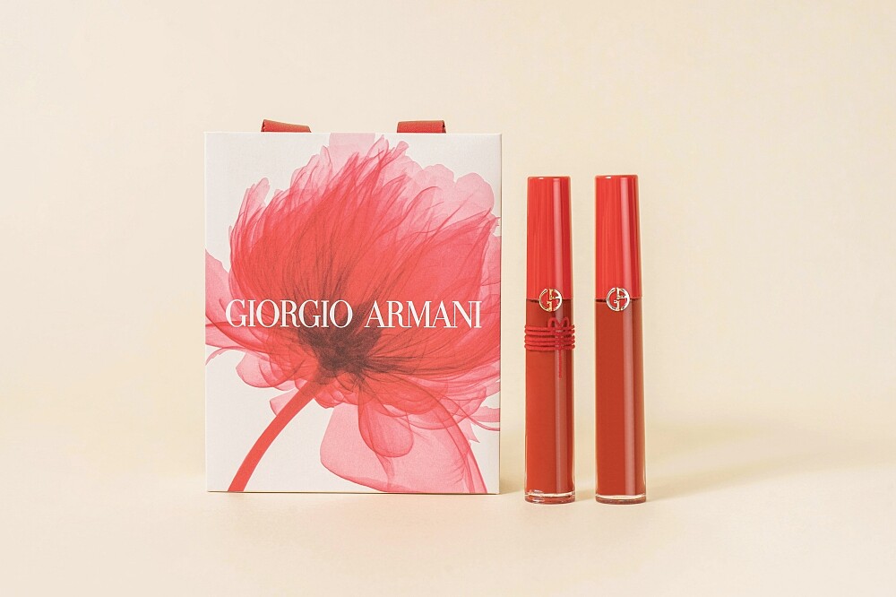 GIORGIO ARMANI特別將「奢華絲絨訂製唇萃」人氣色號#206紅棕玫瑰、#405緋紅禮帽、#415楓紅玫瑰,以亞曼尼先生喜愛的絲絨布料巧妙的幻化為愛情傳說的紅線,纏繞出精緻絲絨心型與祈求緣分的線條。紅色管身上將時髦銀色LOGO換上優雅金色,在每分每秒都緊牽緣分,細細品味相遇相知的美好。