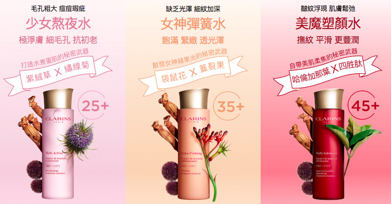 讓蔡瑞雪、任家萱、卡登媽咪都驚呼用一次就有感的全新「分齡訂製精華水」是業界唯一根據不同肌膚需求打造的超神品,以有機紅蔘為基礎,各自添加不同天然植萃成分高達97%,「少女熬夜水」以紫絨草與繡線菊萃取改善油光滿面,熬夜也沒在怕!「女神彈簧水」袋鼠花與有機蓋裂果萃取膨彈水潤仙女肌,更威的「美魔塑顏水」大氣加入有機哈倫加那葉萃取與四胜肽,拍入水同時達到緊緻感,M編更要說不愧是植萃芳療專家克蘭詩,特別調製適合現代人壓力緊繃的香草木質香,每次拍拍製精華水肌膚都是快速紓壓儀式!