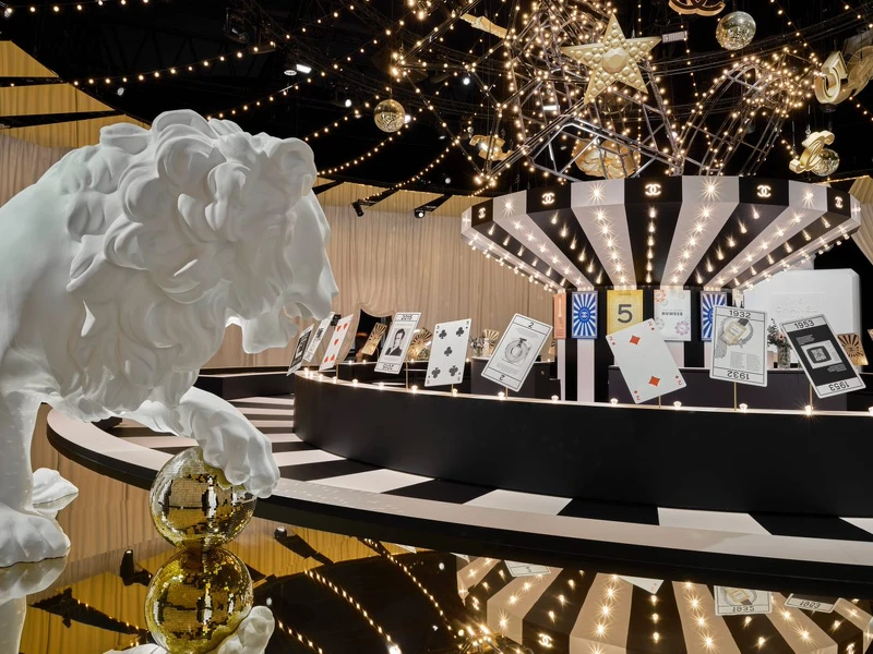 宛如馬戲團的中央入口區,有五支香奈兒N°5、摩登CoCo、Chance、藍色男性香水及LES EXCLUSIFS巨型香水,分別代表不同的入口;代表香奈兒女士星座的獅子雕塑陳列,閃閃發光的經典符碼高掛天空,加上舞者們隨意曼妙演繹舞姿,營造出如夢似幻的神祕氣息。